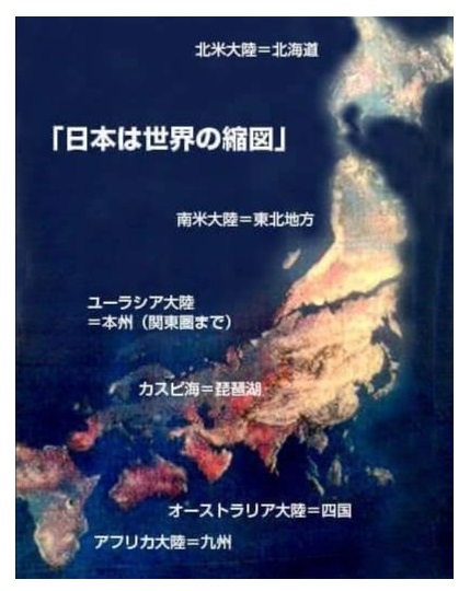 右上から左下に向かって、北米、南米、ユーラシア、オセアニア、アフリカとなります。エベレストの位置には富士山、カスピ海には琵琶湖が対応しています。ほぼ、完全に近い一致と言えます。私はこれを偶然の一致とは思っていません。オラクルによれば、日本はエネルギー的に各大陸につながっているそうです。私の意見では、この小さな島国が、ある時点において、世界にフラクタル効果を及ぼすと考えます。この「日本雛形論」は、『日月神示』に源流があります。