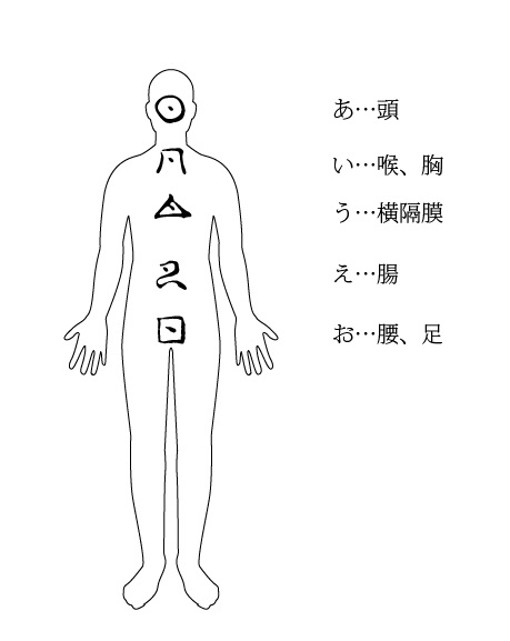 一般的なチャクラシステムの7つに対して、日本語の母音は5つと数は異なりますが、おおまかな位置として5つの人体の場所に置き換えられているようにも感じられます。チャクラというよりは、人体の形状に関係しているようにも見えます。(あ:脳、い:喉、う:鳩尾、え:腸、お:骨盤) 人体に対応した形魂の要素が含まれているのかもしれません。