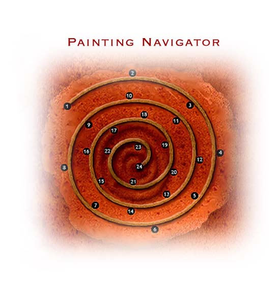 第23室の壁画の中央のタイルをクリックしてみてください。第24室つながっています。これと似た「隠し通路」が他の部屋の壁画にも隠されていますので、探してみてください。パスワードを求められる部屋もあります。謎解きに挑戦してみてください。
